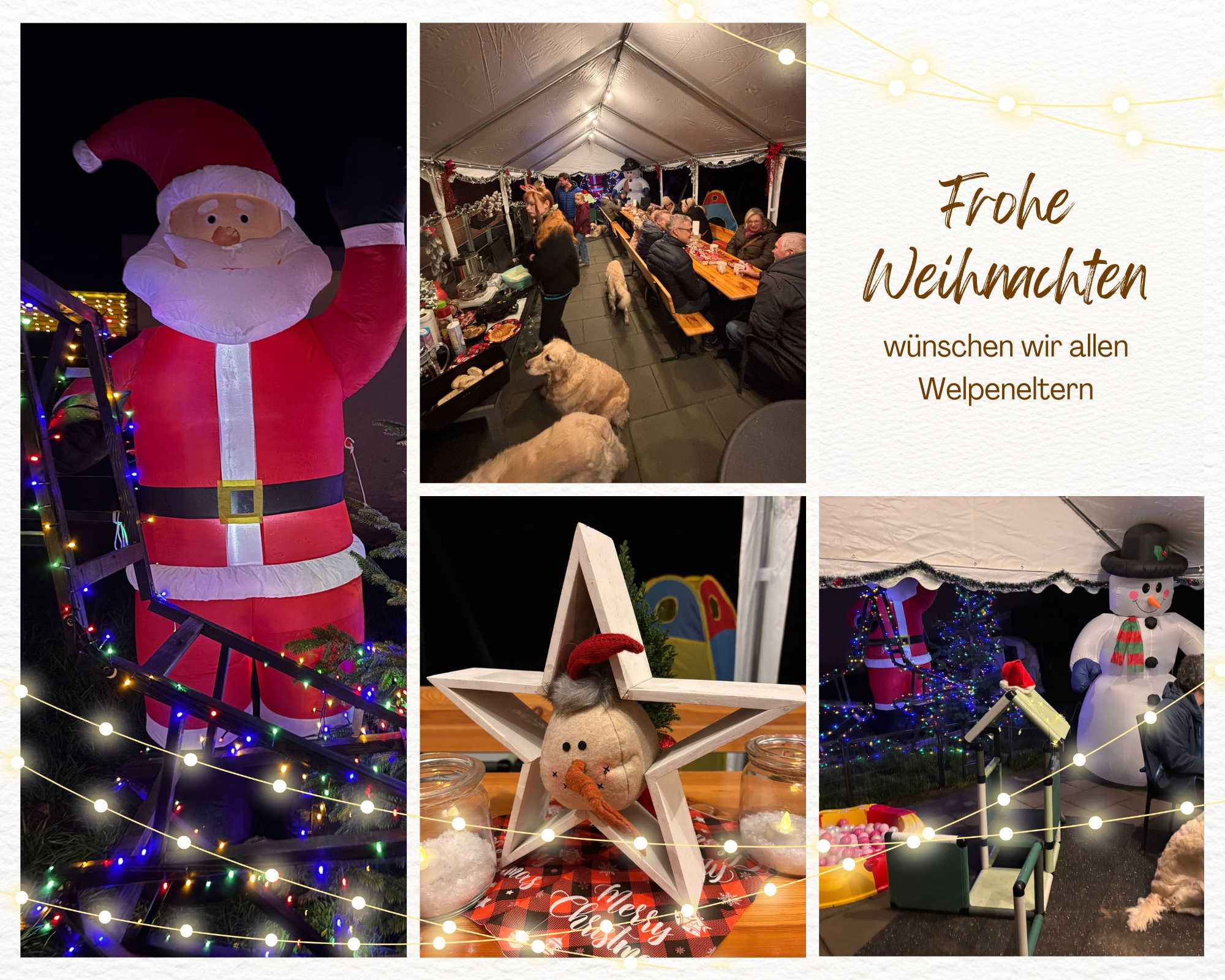 Ein Highlight dieser Welpenzeit war unser kleiner Weihnachtsmarkt am 4. Advent, zu dem wir die Welpeneltern, unser Rudel und natürlich die Welpen selbst eingeladen hatten. Zwischen Bratwurstduft, frisch gebackenen Waffeln, warmem Punsch und Kakao entstand eine gemütliche, festliche Atmosphäre. Weihnachtliche Dekoration und Musik sorgten für ein stimmungsvolles Ambiente, in dem viele neue und nette Bekanntschaften geschlossen wurden. Es war ein geselliges Miteinander, das uns allen noch lange in Erinnerung bleiben wird.